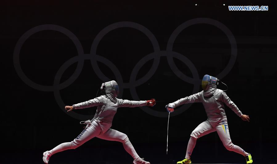 Russia's Yana Egorian (L) competes with Ukraine's Olena Kravatska during the women's sabre team gold medal match of Fencing at the 2016 Rio Olympic Games in Rio de Janeiro, Brazil, on Aug. 13, 2016. Russia won the gold medal. (Xinhua/Yin Bogu)