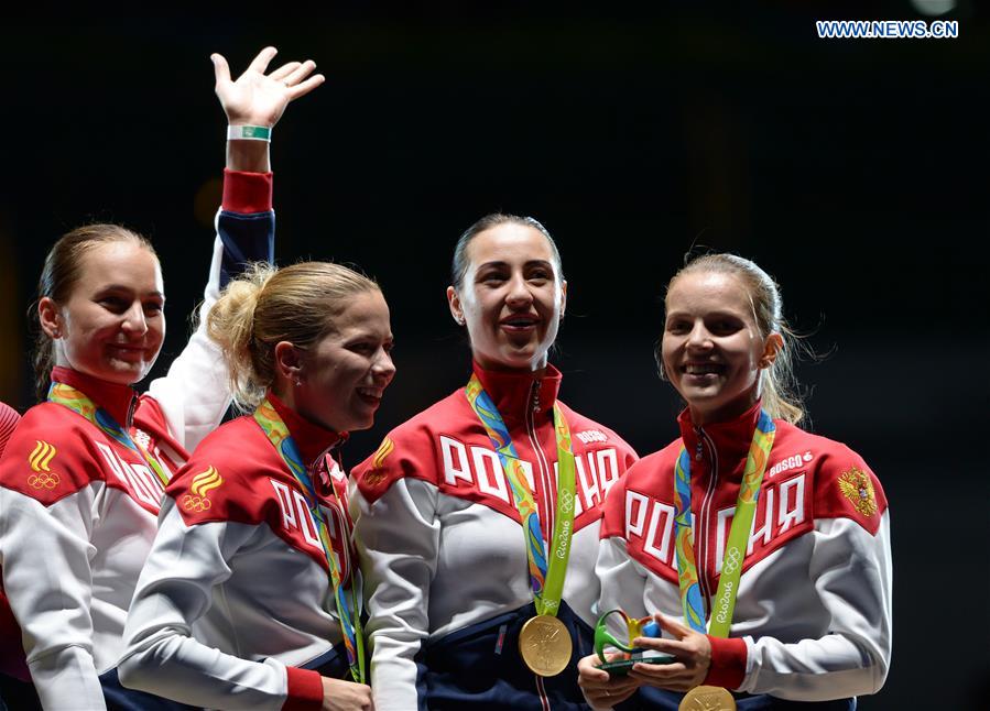 Gold medalists Russia's athletes attend the awarding ceremony for the women's sabre team final of Fencing against Ukraine at the 2016 Rio Olympic Games in Rio de Janeiro, Brazil, on Aug. 13, 2016. (Xinhua/Yin Bogu)