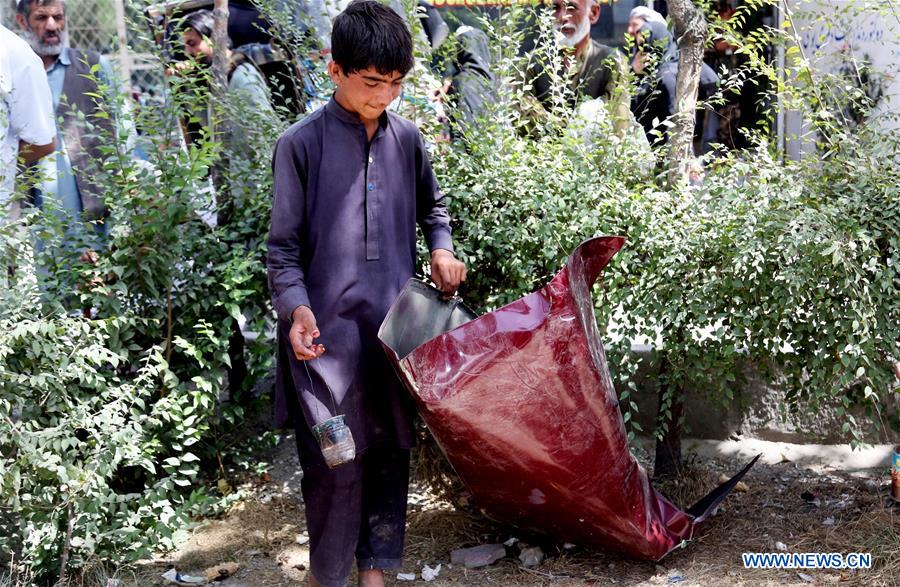 An Afghan child carries the debris of a car damaged in a blast in Kabul, capital of Afghanistan, Aug. 15, 2016. Three Afghans were injured in a bomb attack in central Kabul on Monday, a witness and officials said. (Xinhua/Jawid Omid)