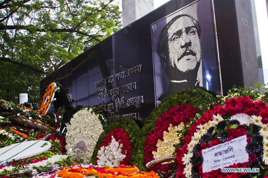 Photo taken on Aug. 15, 2016 shows floral tributes during a commemoration of Bangladesh's founding father and first president Sheikh Mujibur Rahman in Dhaka, Bangladesh. The nation commemorated on Monday the 41st death anniversary of Bangladesh's founding father and first president Sheikh Mujibur Rahman who was assassinated on Aug. 15, 1975. (Xinhua/Shariful Islam)