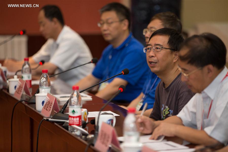 Pan Jianwei (2nd R), chief scientist of the Quantum Experiments at Space Scale (QUESS) project with the Chinese Academy of Sciences (CAS), speaks during a press conference at the Jiuquan Satellite Launch Center, Aug. 15, 2016. China successfully launched the world's first quantum satellite from the Jiuquan Satellite Launch Center in northwestern Gobi Desert at 1:40 a.m. on Tuesday. After three months of in-orbit testing, the satellite is designed to start "hack-proof" quantum communications by transmitting uncrackable keys from space to the ground. (Xinhua/Jin Liwang)
