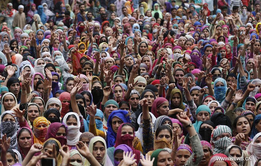 Kashmiri people shout slogans against civilian killings by Indian security force in Aripanthan village, Srinagar, summer capital of Indian-controlled Kashmir, Aug. 16, 2016. (Xinhua/Javed Dar)