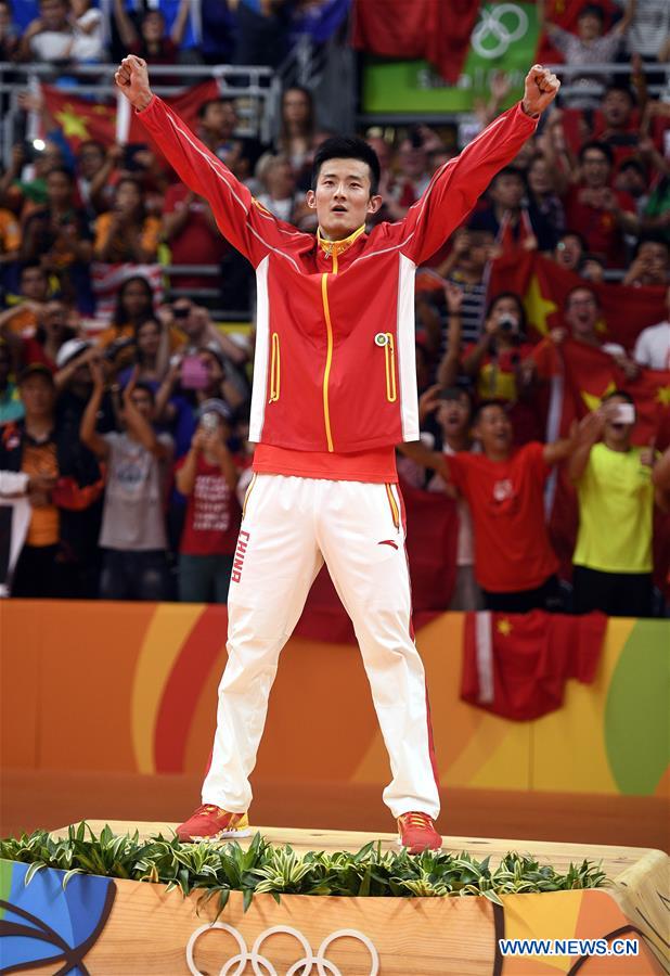 China's Chen Long attends the awarding ceremony of the men's singles of badminton at the 2016 Rio Olympic Games in Rio de Janeiro, Brazil, on Aug. 20, 2016. Chen took the title of the event after beating Lee 2-0.(Xinhua/Wang Peng)