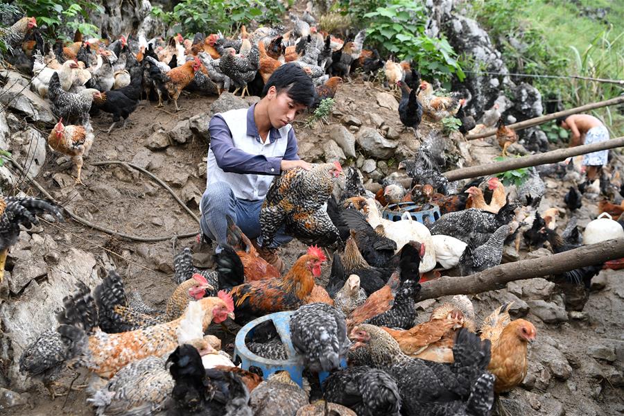 Lan Zhiping checks chickens at his cooperative in Nongxiong Village, Dahua Yao Autonomous County, south China's Guangxi Zhuang Autonomous Region, Aug. 11, 2016. Nongxiong Village, located in mountainous areas of Guangxi, has 123 families living under poverty standard among its nearly 2000 villagers. Lan Zhiping, 28 years old, has found out a way to lift villagers out of poverty through chicken raising industry. This year, he established a poultry raising cooperative with four other villagers, in which more than 2,300 chickens are raised. A hatching base which can hatches 8,000 to 10,000 baby chicks in one month is under construction. The chicken raising industry has also received support from the local government of Dahua County, who plans to raise 2 million chicken in 2016 as to shake off poverty. (Xinhua/Li Xin)