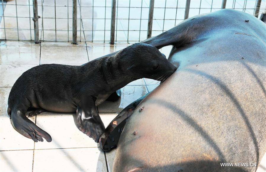 A California sea lion feeds its baby at Harbin Polarland in Harbin, capital of northeast China's Heilongjiang Province, Aug. 23, 2016. The sea lion "De Bei" gave birth to a sea lion cub at the park on Monday. (Xinhua/Wang Kai)