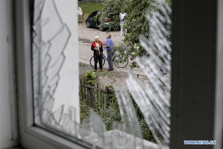 Local citizens are seen through a broken window of damaged apartment in Gorlovka, Ukraine on August 25, 2016. At least one person was killed and several were injured as a result of artillery clash between Ukrainian troops and rebels. Several apartments were seriously damaged. (Xinhua/Alexander Ermochenko)