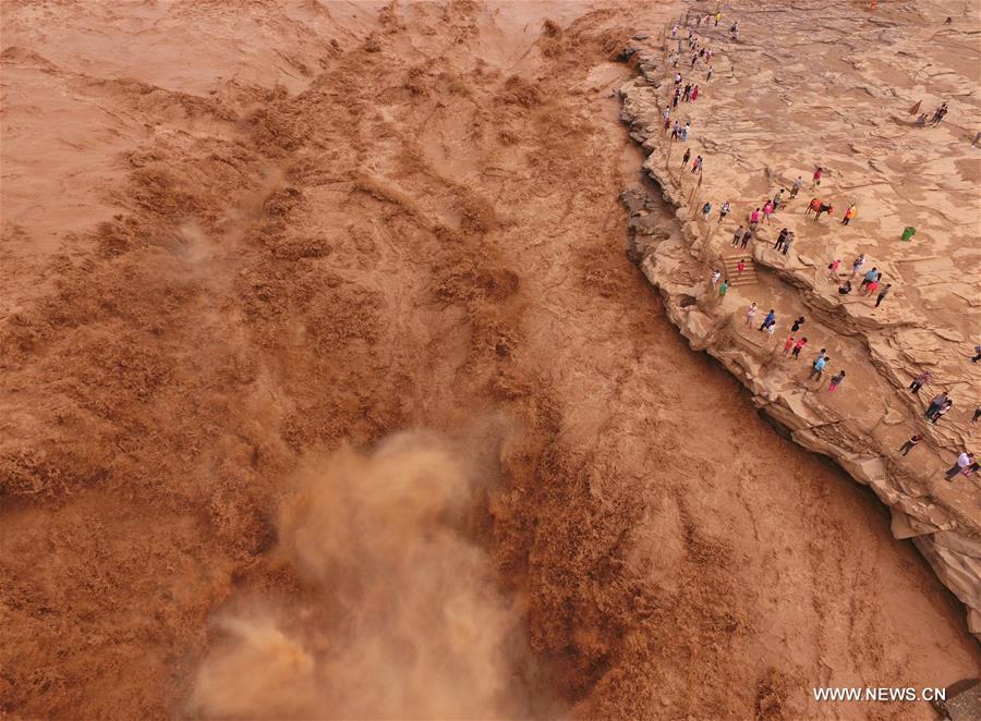 Aerial photo taken on Aug. 25, 2016 shows the Hukou Waterfalls on the Yellow River in Linfen, north China's Shanxi Province. (Xinhua/Niu Yixin)