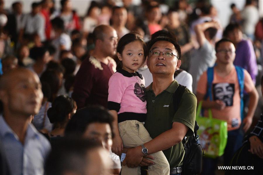 A passenger carrying a child is seen at a waiting room of Lanzhou Railway Station in Lanzhou, capital of northwest China's Gansu Province, Aug. 26, 2016. Influenced by continuous rainfall, the train service of "Z76" and "1096" were disrupted and more than 30 others were delayed at Lanzhou Railway Station since Aug. 25. (Xinhua/Chen Bin)