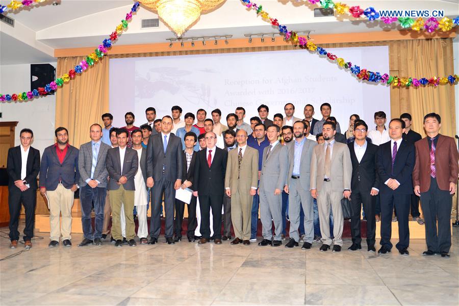Afghan students who have been offered scholarships by the Chinese government to study in China pose for a group photo with officials during a farewell reception at the Chinese Embassy in Kabul, capital of Afghanistan, on Aug. 27, 2016. (Xinhua/Dai He)