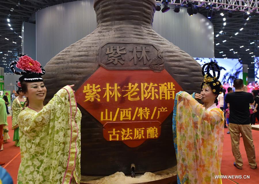 Actresses promote vinegar at the Shanxi Wheaten Food Festival in Taiyuan, capital of north China's Shanxi Province, Aug. 26, 2016. With a continued slump in the coal industry, Shanxi Province is seeking to transform its economic development by boosting non-coal industries such as vinegar-making industry. As the birthplace of mature vinegar, Shanxi Province holds various culture events to display its vinegar culture. Also mechanization has been applied during the process to improve the yield of mature vinegar. (Xinhua/Cao Yang)