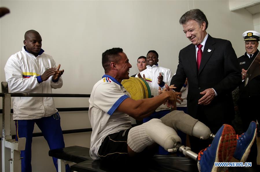 Colombian President Juan Manuel Santos (R) shakes hands with an amputee at the opening of the Inclusive Rehabilitation Center for the Public Force members, while the bilateral and definitive ceasefire between the government and the Revolucionary Armed Forces of Colombia (FARC) takes effect, in Bogota, Colombia, on Aug. 29, 2016. FARC guerrilla group announced on Sunday a definitive ceasefire starting at midnight. (Xinhua/Mauricio Alvarado/COLPRENSA)