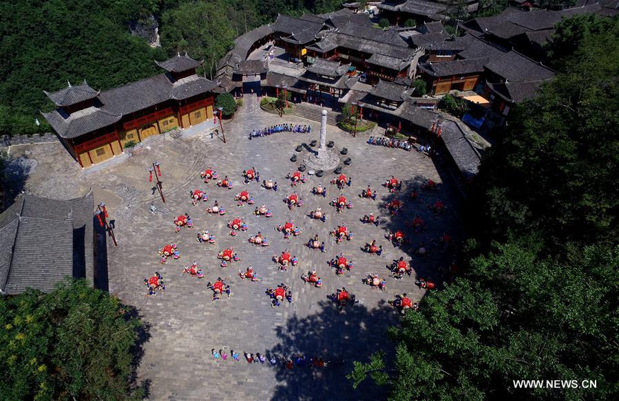 People of the Miao ethnic group play drums to celebrate autumn harvest in Songtao Miao Ethic Autonomous County, southwest China's Guizhou Province, Sep. 2, 2016. (Xinhua/Long Rong) (wyo)