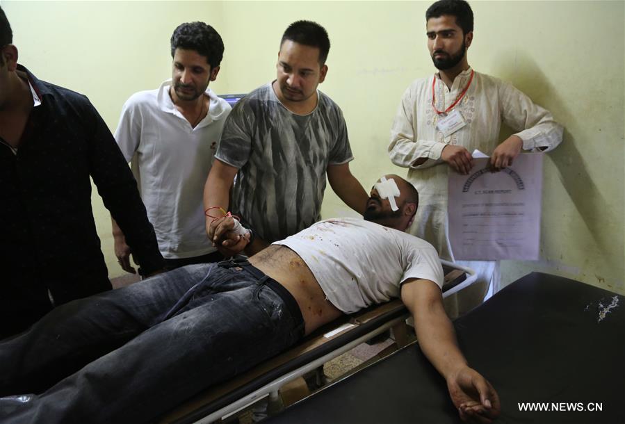 A wounded press photographer is carried on a stretcher in a hospital after getting pellet injuries fired by Indian police during a protest in Srinagar, summer capital of Indian-controlled Kashmir, on Sept. 4, 2016. Large-scale protests against New Delhi's rule are going on in the Muslim majority areas of the restive region since July 8. (Xinhua/Javed Dar)