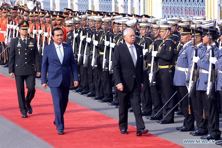 Thai Prime Minister Prayuth Chan-ocha (L, front) and visiting Malaysian Prime Minister Najib Razak (R, front) inspect the guard of honor during a welcome ceremony at the Government House in Bangkok, Thailand, Sept. 9, 2016. (Xinhua/Rachen Sageamsak)