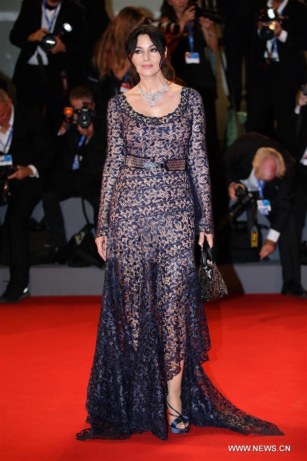 Actress Monica Bellucci arrives for the premiere of the movie "Na Mlijecnom Putu" (On The Milky Road) at the 73rd Venice Film Festival in Venice, Italy, on Sept. 9, 2016. (Xinhua/Jin Yu)