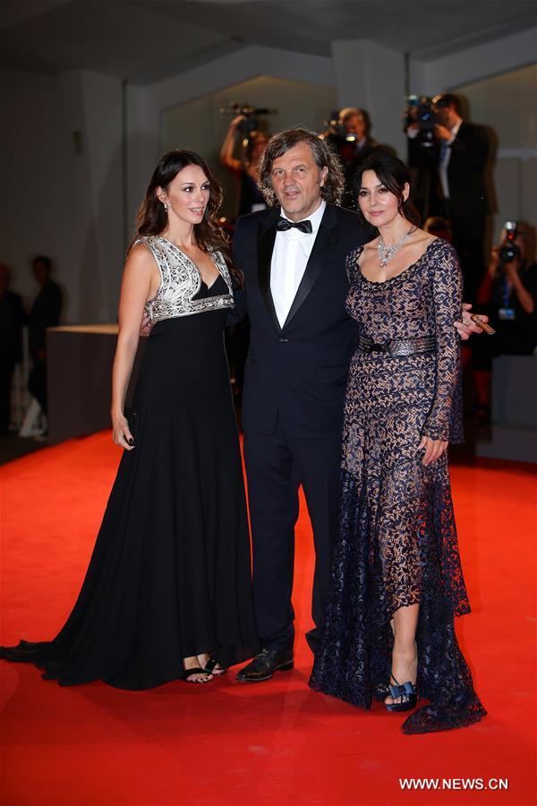 Director Emir Kusturica(C), actress Monica Bellucci(R) and Sloboda Micalovic arrive for the premiere of the movie "Na Mlijecnom Putu" (On The Milky Road) at the 73rd Venice Film Festival in Venice, Italy, on Sept. 9, 2016. (Xinhua/Jin Yu)