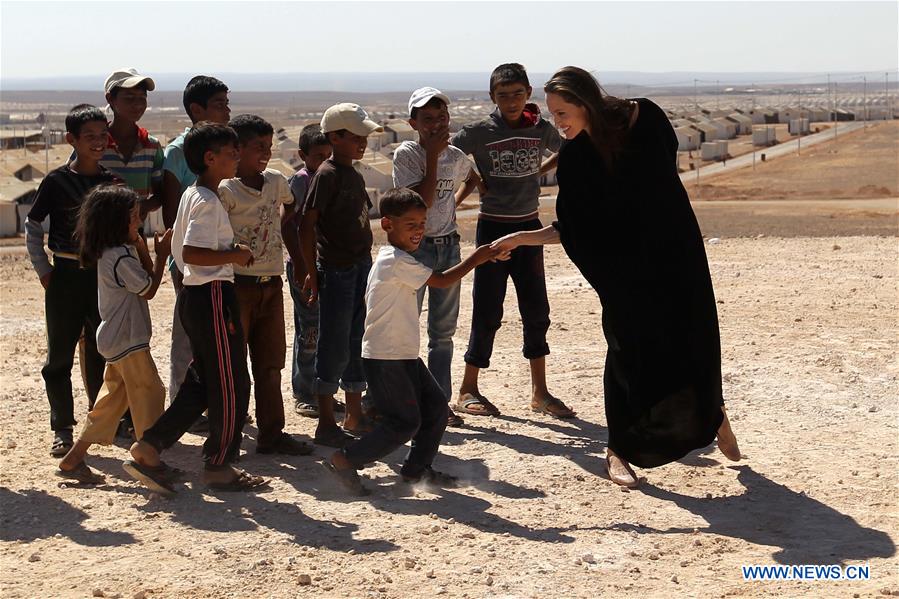 U.S. actress and special envoy to the United Nations High Commissioner for Refugees(UNHCR) Angelina Jolie(1st R) talks to children during a visit to a Syrian refugee camp in Azraq, Jordan, on Sept. 9, 2016. (Xinhua/Mohammad Abu Ghosh)