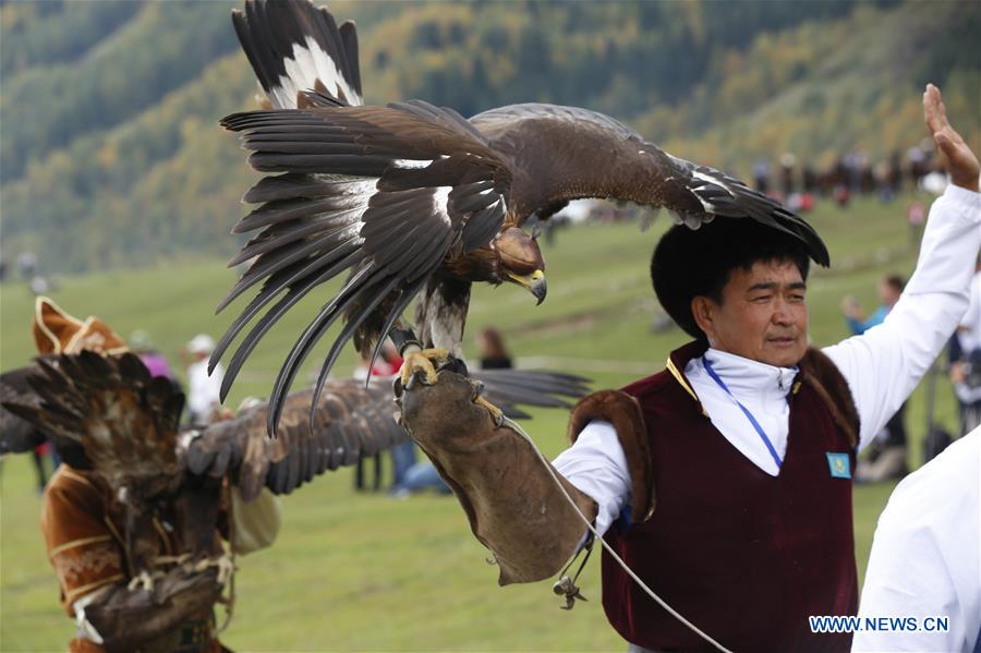 A competitor for traditional hunting reacts with his falcon during the third day of the Second World Nomad Games in Cholpon-Ata, Kyrgyzstan, on Sept. 5, 2016. (Xinhua photo/Roman Gainanov)