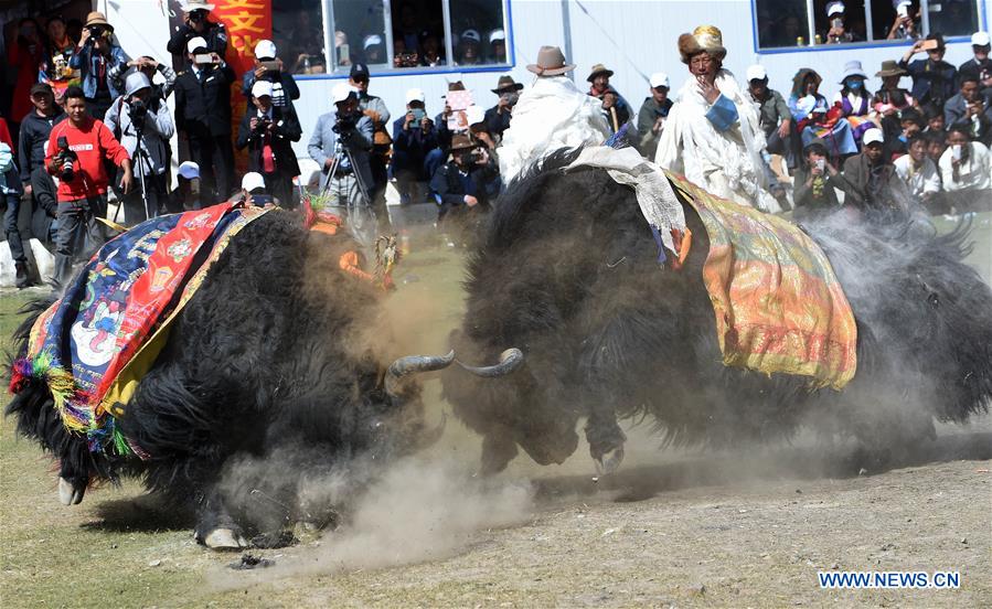 Yaks fight during a bullfighting festival in a township of Xigaze City, southwest China's Tibet Autonomous Region, Sept. 8, 2016. (Xinhua/Chogo)