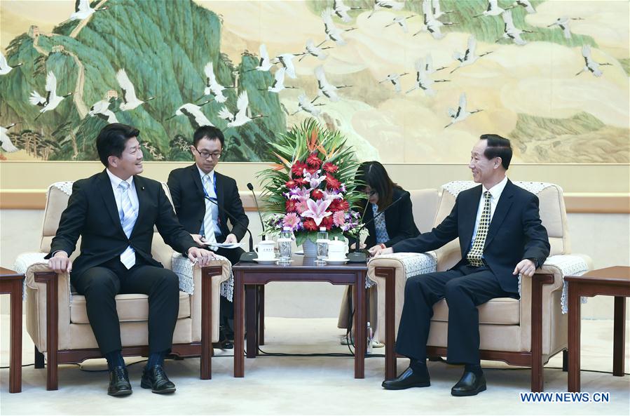 Wang Jiarui (R, front), vice chairman of the National Committee of the Chinese People's Political Consultative Conference, meets with a Japanese delegation led by Hirotaka Ishikawa, a member of the New Komeito Party, in Beijing, capital of China, Sept. 12, 2016. (Xinhua/Zhang Ling)