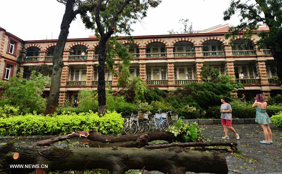 Students stand by fallen trees blown down by gale at Xiamen University in Xiamen, southeast China's Fujian Province, Sept. 15, 2016. Xiamen University was severely damaged due to the effect of Typhoon Meranti. (Xinhua/Wei Peiquan)