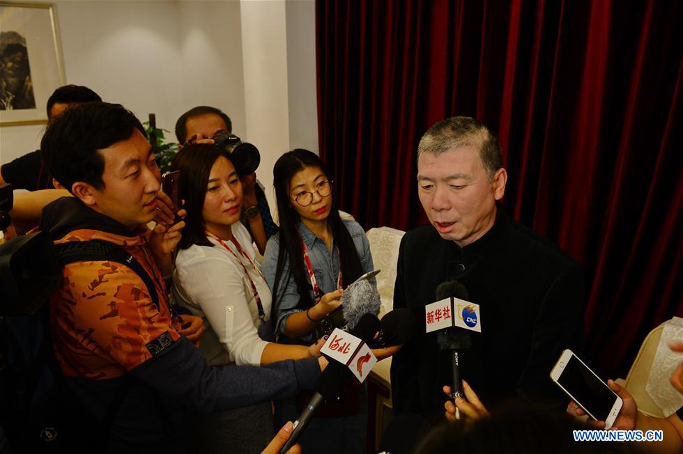 Director FengXiaogang (R) accepts interview after the opening ceremony of the 25th China Golden Rooster & Hundred Flowers Film Festival inTangshan, north China's Hebei Province, Sept. 21, 2016. (Xinhua/ZhuXudong)