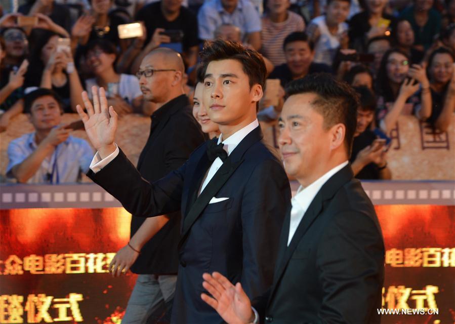 Actor Li Yifeng (2nd R) attends the red carpet event before at the awarding ceremony of the 25th China Golden Rooster and the 33rd Hundred Flowers Film Festival in Tangshan, north China's Hebei Province, Sept. 24, 2016. (Xinhua/Mou Yu)