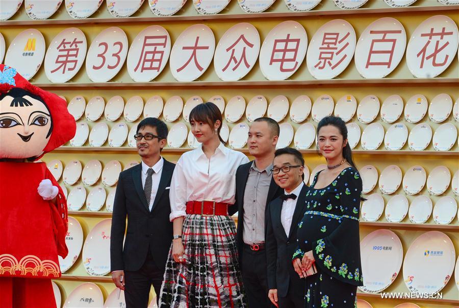 Cast of the film "Monster Hunt" attend the red carpet event before the awarding ceremony of the 25th China Golden Rooster and the 33rd Hundred Flowers Film Festival in Tangshan, north China's Hebei Province, Sept. 24, 2016. (Xinhua/Zhu Xudong)