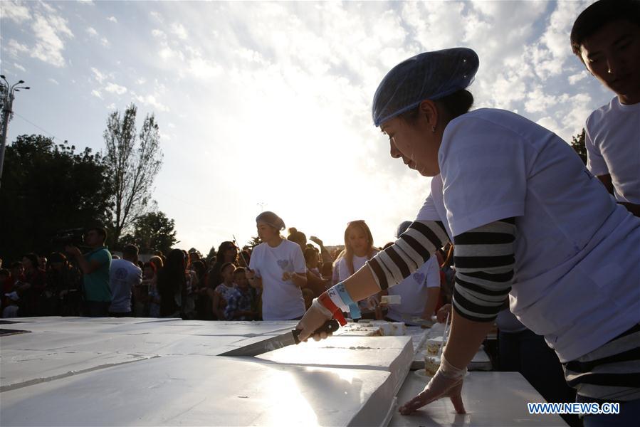 A baker cuts a cake at a park in Bishkek, Kyrgyzstan, Sept. 25, 2016. A cake measuring 1.5 tons and 100 square meters was prepared by a group of Kyrgyz bakers on Sunday in Bishkek. The cake was on sale to the public to raise money for charity. (Xinhua/Roman Gainanov)