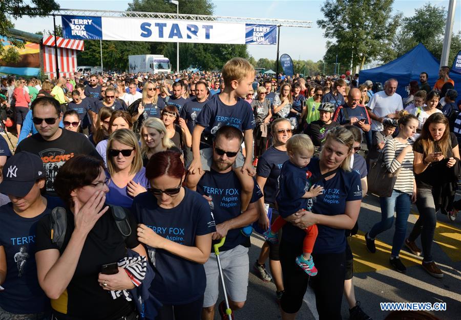 People take part in the 2016 Terry Fox Run in Zagreb, capital of Croatia, Sept. 25, 2016. Thousands of people participated in the event to raise money for the fight against cancer and to honour the legacy of Terry Fox and his Marathon of Hope. (Xinhua/Miso Lisanin)