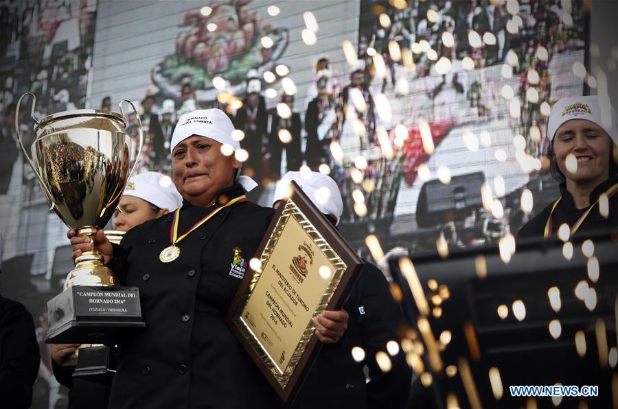 Fernanda Ramos reacts after winning the championship of a Hornado-making contest in Otavalo, province of Imabura, Ecuador, on Sept. 25, 2016. Hornado is a typical Ecuadorian dish made with baked pork. Twenty competitors participated in the contest organized by Ecuador's Ministry of Tourism. (Xinhua/Santiago Armas)