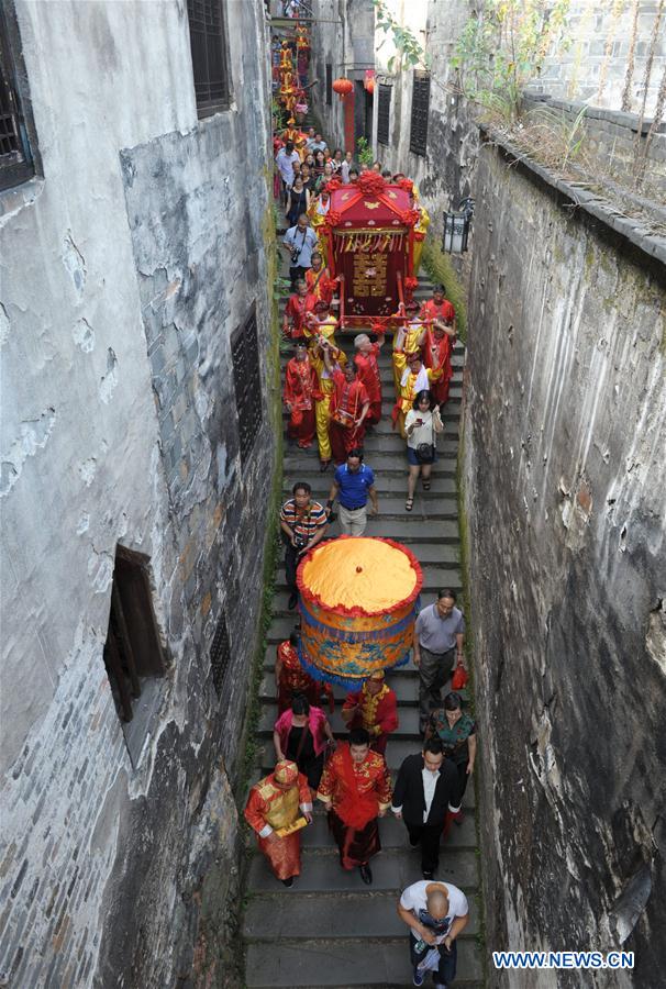 Bridegroom Shen Kai and bride Shi Shaodan take part in a traditional Chinese wedding ceremony in the ancient town of Hongjiang in Huaihua City, central China's Hunan Province, Sept. 25, 2016. (Xinhua/Yin Zhong)