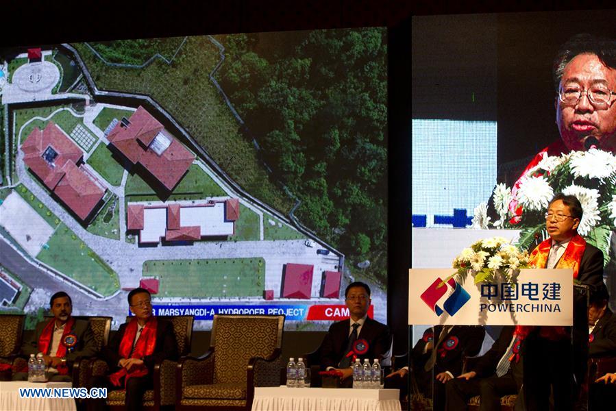 Sheng Yuming (1st R), chairman of Power China Resource, delivers a speech during the "Power Generation Ceremony" of Upper Marsyangdi-A Hydroelectric Project in Kathmandu, Nepal, Sept. 26, 2016. Upper Marsyangdi-A Hydroelectric Project, developed by a China-Nepal joint venture company, started generating power from Monday. Nepal's Energy Minister Janardan Sharma ordered the release of the power from the project at a "Power Generation Ceremony" held in Kathmandu and the power was connected with the national grid instantly. (Xinhua/Pratap Thapa)