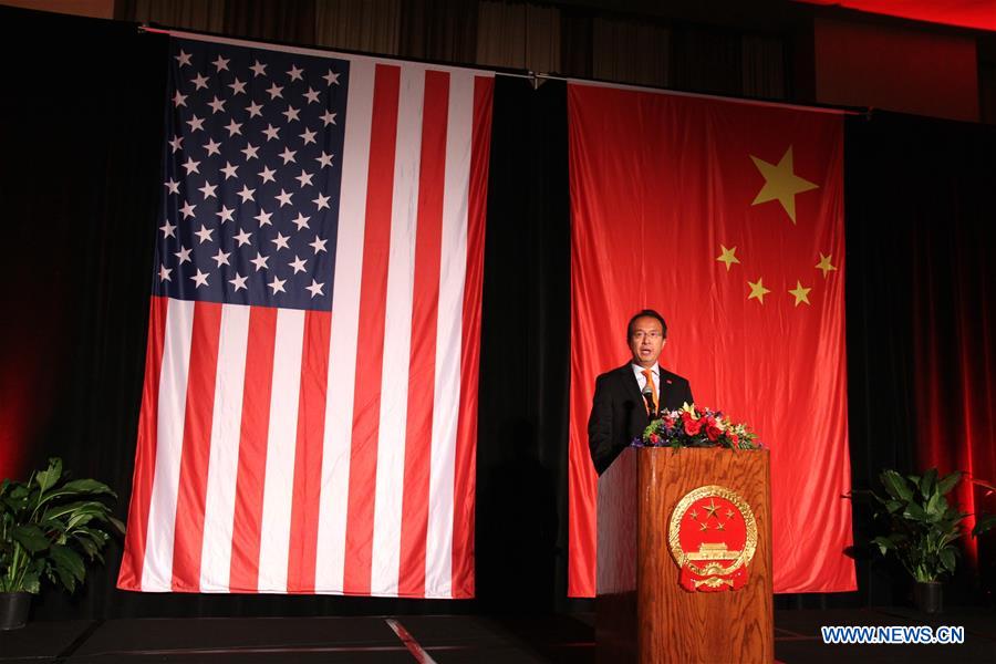 Hong Lei, Chinese Consul General in Chicago, addresses a reception celebrating the 67th anniversary of the founding of the People's Republic of China, in Chicago, the United States, Sept. 26, 2016. (Xinhua/Wang Ping)