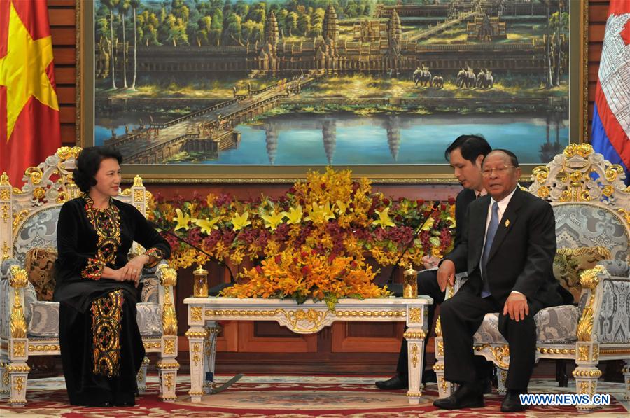 Vietnamese National Assembly Chairwoman Nguyen Thi Kim Ngan (L) meets with Cambodian National Assembly President Samdech Heng Samrin in Phnom Penh, Cambodia, Sept. 27, 2016. Cambodia on Tuesday rolled out its red carpet for Vietnamese National Assembly Chairwoman Nguyen Thi Kim Ngan on her official visit to the kingdom to enhance bilateral relations and cooperation. (Xinhua/Sovannara)