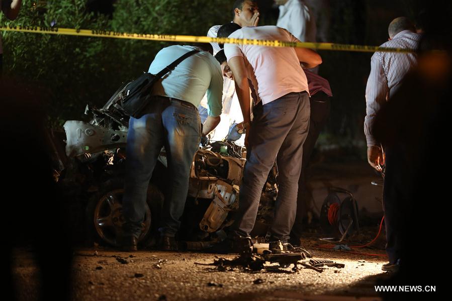 Egyptian security forces inspect the blast scene in New Cairo, Egypt on Sept. 29, 2016. Egypt's interior ministry said the car bomb exploded as the top prosecutor-general's deputy Zakaria Abd El-Aziz was passing in a convoy in the First Settlement area of New Cairo. (Xinhua/Ahmed Gomaa)