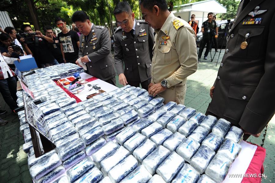 Thai police officers display a total of one million amphetamine tablets seized in Ayutthaya Province during a press briefing in Bangkok, Thailand, Oct. 3, 2016. (Xinhua/Rachen Sageamsak)