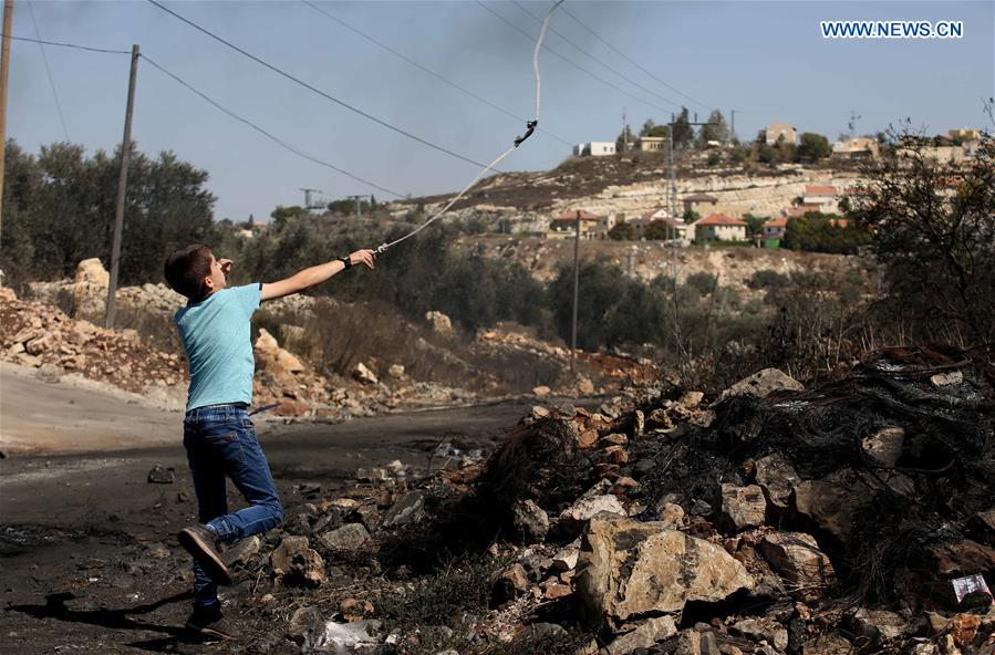 A Palestinian protester hurls stones at Israeli soldiers during clashes after a protest against the expanding of Jewish settlements in Kufr Qadoom village near the West Bank city of Nablus, on Oct. 7, 2016. (Xinhua/Ayman Nobani)