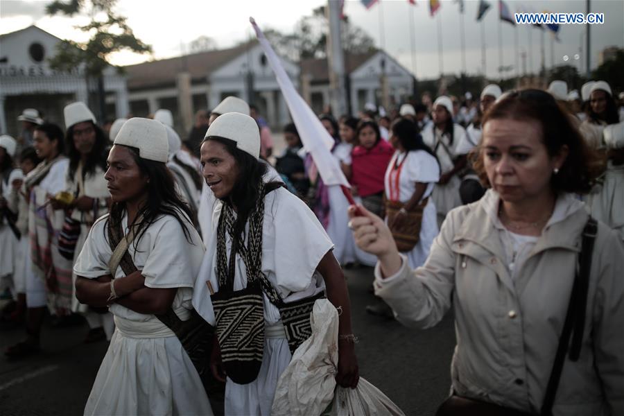 People demonstrate for peace, in Bogota, Colombia, on Oct. 10, 2016. People paraded on Monday from the National Park to the Bolivar Square in support of the ongoing peace negotiations between the Revolutionary Armed Forces of Colombia (FARC) and the Colombian government. (Xinhua/Jhon Paz)