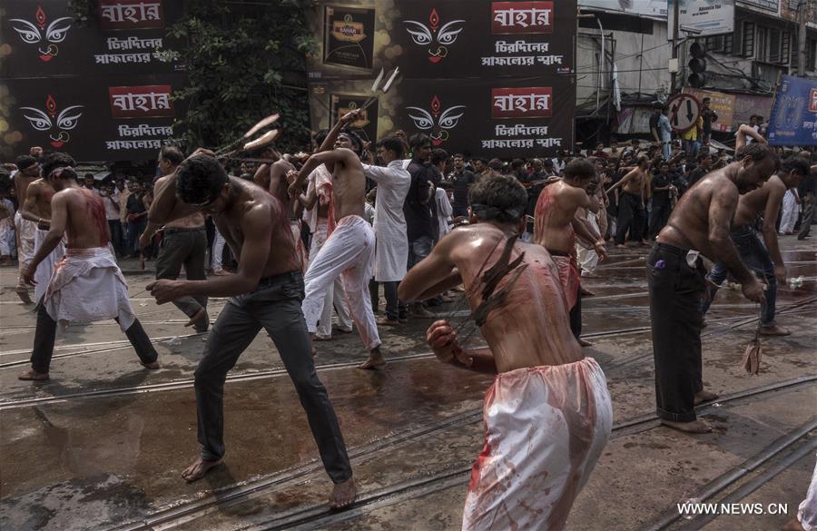 Indian Shiite Muslims perform a ritual of self-flagellation with razor blades during a Muharram procession in Kolkata, capital of eastern Indian state West Bengal, on Oct. 12, 2016. Ashura, the 10th day of Muharram, marks the death of Imam Hussein, a grandson of Prophet Muhammad, who was killed and buried in Karbala, Iraq in 680 AD. (Xinhua/Tumpa Mondal)