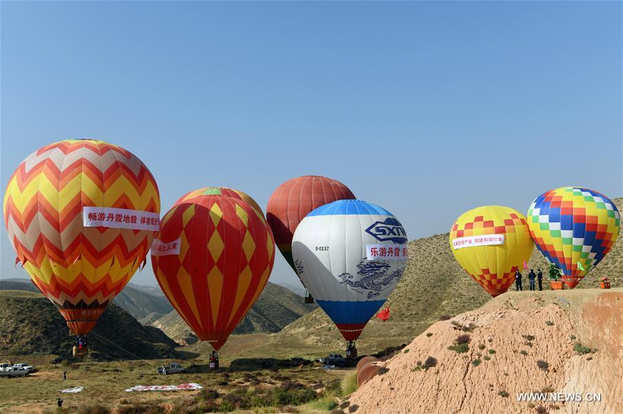 Hot air balloons prepare to fly off in the Shuping scenic area of Danxia landform, a unique type of landscapes formed from red sandstone and characterized by steep cliffs, in Xinghua Village of Shuping Town in Yongdeng County under Lanzhou, capital of northwest China's Gansu Province, Oct. 15, 2016. A hot air balloon tourism base opened to the public on Saturday. Visitors could overlook Danxia landform from the sky by taking hot air balloons. (Xinhua/Fan Peishen)