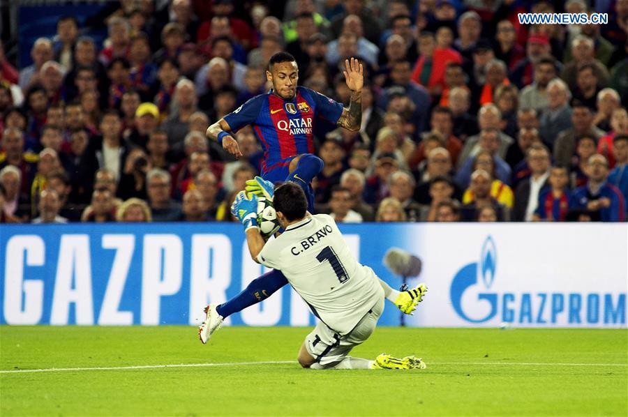 Barcelona's Neymar (Top) vies with Manchester City's Chilean goalkeeper Claudio Bravo during the UEFA Champions League Group C football match between Barcelona and Manchester City at the Camp Nou stadium in Barcelona, Spain, Oct. 19, 2016. Barcelona won 4-0. (Xinhua/Lino De Vallier)