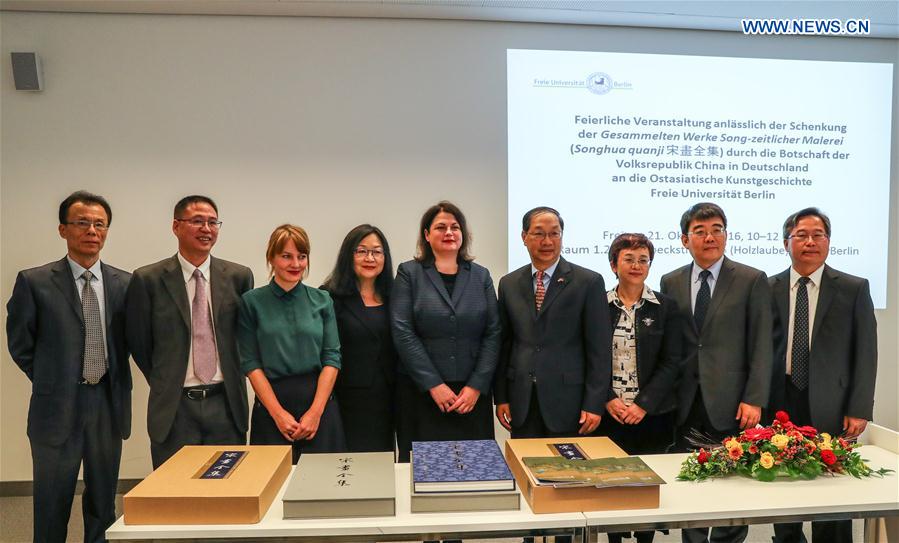 A donation ceremony is held at the Free University of Berlin, in Berlin, capital of Germany, on Oct. 21, 2016. Chinese Embassy in Berlin donated on Friday the Collective Works of Paintings of Song Dynasty to the Art History of East Asia division of Art History Department in the Free University of Berlin. (Xinhua/Shan Yuqi)
