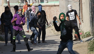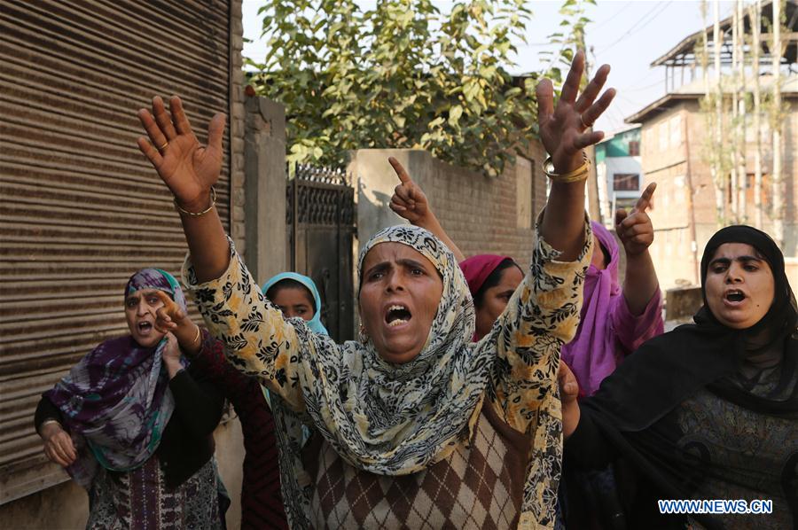 Kashmiri protesters shout slogans during a protest in Srinagar, summer capital of Indian-controlled Kashmir, Oct. 21, 2016. Large-scale protests against New Delhi's rule are going on in the Muslim majority areas of the restive region since July 8, following the killing of a top militant commander. (Xinhua/Javed Dar)