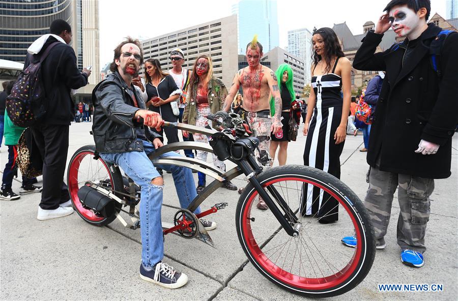 Participants dressed up as zombies pose for photos during the 2016 Toronto Zombie Walk at Nathan Phillips Square in Toronto, Canada, Oct. 29, 2016. Hundreds of participants gathered to celebrate Halloween in Toronto on Saturday. (Xinhua/Zou Zheng)