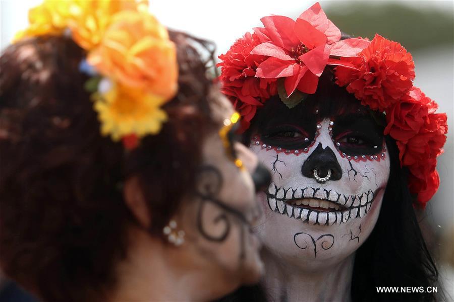 People in special costumes take part in the Feast of the Dead in Sao Paulo, Brazil, on Oct. 30, 2016. The Mexican community in Sao Paulo gathered during the weekend to mark their traditional festival, the Feast of the Dead. (Xinhua/Rahel Patrasso)