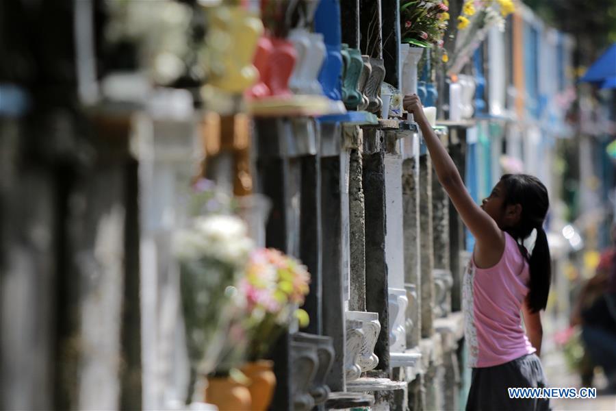 A girl lights a candle on the tomb of her relative in Makati City, the Philippines, Nov. 1, 2016. Local people have the tradition to pay tribute to the dead by visiting tombs of their deceased relatives during All Saints' Day in the Philippines. (Xinhua/Rouelle Umali)