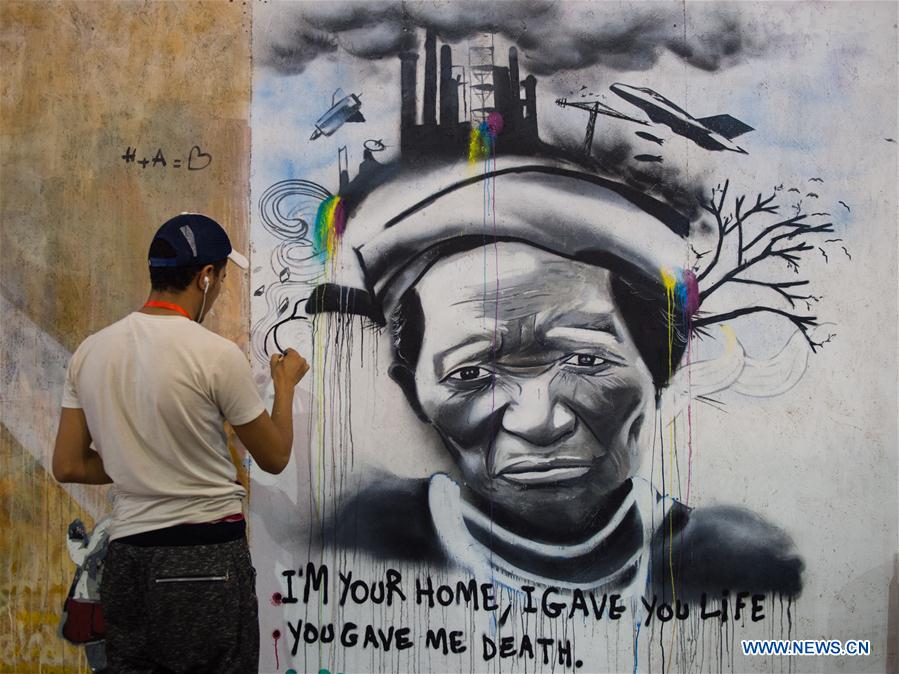 An artist paints on the wall at an exhibition during the COP22 in Marrakech, Morocco, Nov. 8, 2016. The year 2015 was the warmest year on record to date, the World Meteorological Organization (WMO) announced here on Tuesday. (Xinhua/Meng Tao)