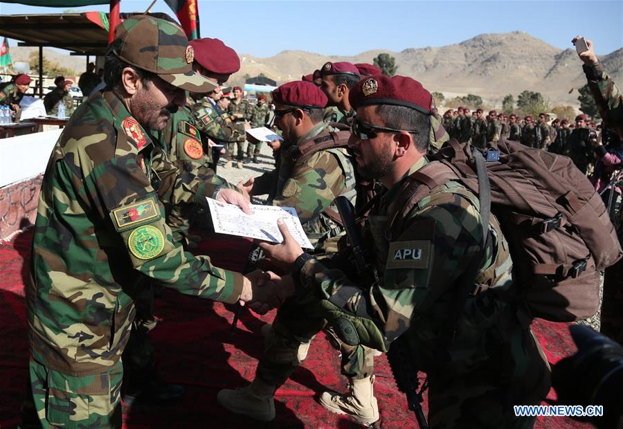 Members of Afghan Special Forces receive their certificates during a graduation ceremony in Kabul, capital of Afghanistan, Nov. 9, 2016. About 800 trainees of Afghan Special Forces graduated on Wednesday after completion of a 16-week training course. (Xinhua/Rahmat Alizadah)