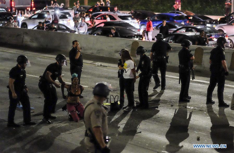 Police arrest demonstrators during a protest against President-elect Donald Trump along a freeway near downtown Los Angeles, the United States, on Nov. 9, 2016. (Xinhua/Zhao Hanrong)